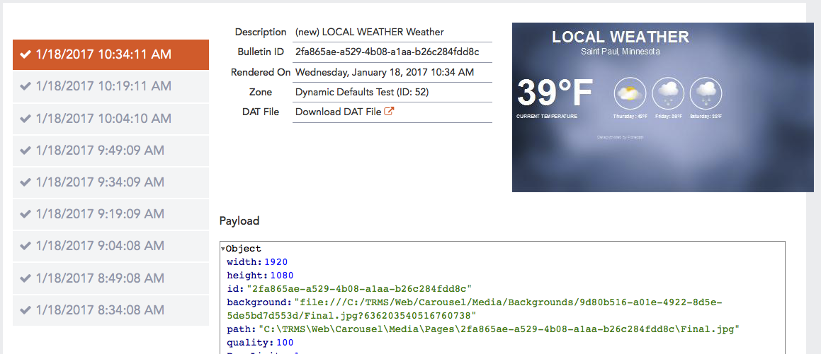 The left side of the screen shows the most recent times that this bulletin was rendered. You can click on each occurrence to view details of that rendering.