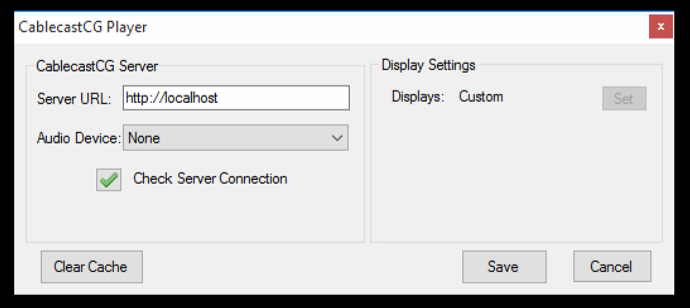 In the configuration menu, you are able to direct the player to your main server that is running Frontdoor which will then load and play the CablecastCG bulletin board. Type in that server's URL or IP address, select an audio device if you plan on using an external audio device, and then Click Save. This will go back out to the loading screen and launch your CablecastCG bulletin board.