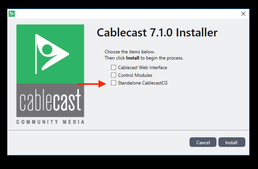 When you double click on the installer after downloading it, the installer window will open. It will give you 3 different options to choose from on what you would like to install. You will want to select the Standalone CablecastCG option and then click the install option. This will install the appropriate things to run the CablecastCG player. When the installer is finished, click the finish button.