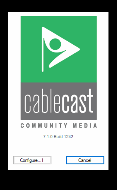This will open the Cablecast Loading window with the Configure and Cancel button. Similar to what it was like in Carousel. To point the CablecastCG player to your Frontdoor server click the Configure button.