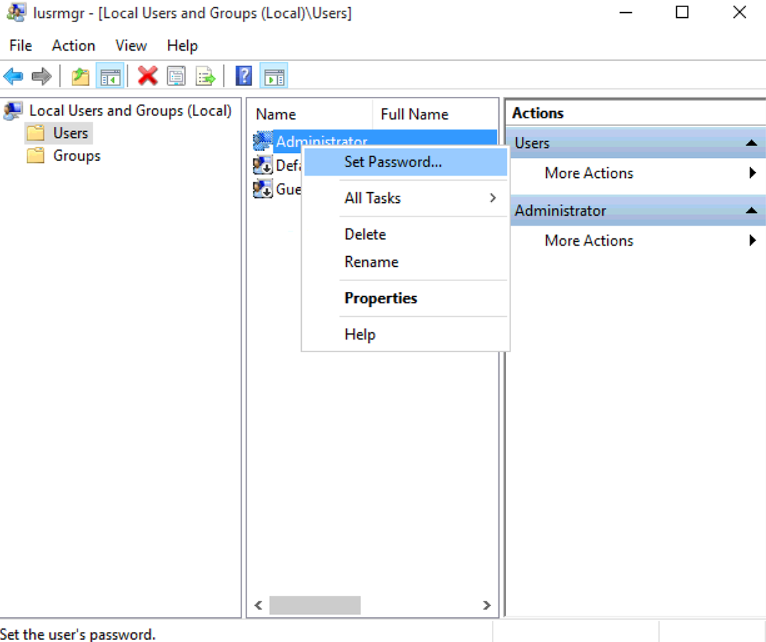 Click Users on the left and right click on Administrator account and select Set Password