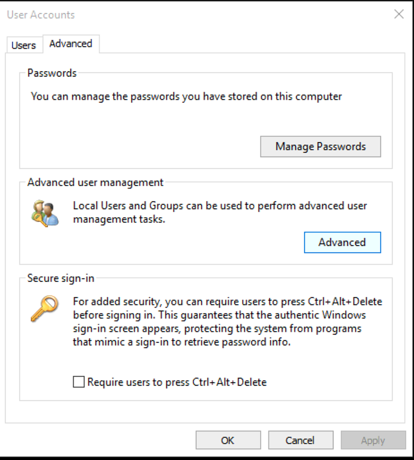 Under Advanced tab, Advanced user management, click Advanced button