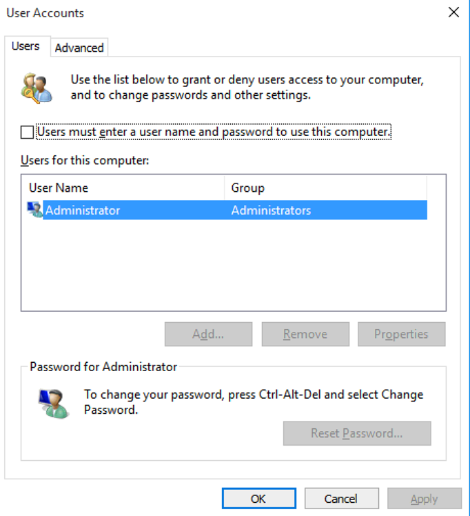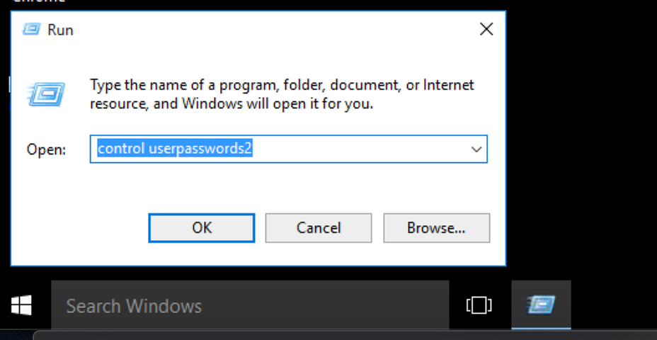 From the Windows desktop open Run dialog box (Windows Key+R key), type "control userpasswords2" and hit enter