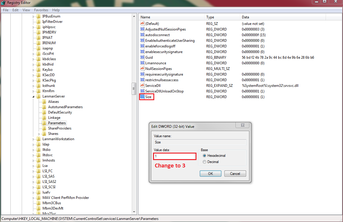 SYSTEM\CurrentControlSet\Services\LanmanServer\Parameters\Size