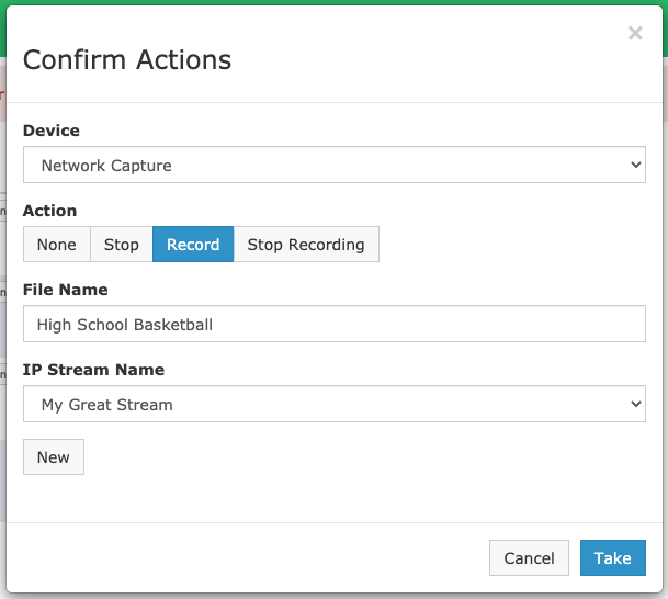 A new Action window will open. Click on the Record option, then put in a name you want for the file you are about to record. Then click on the dropdown menu for IP Stream Name and select the stream you want to record. When ready to start the recording click Take in the bottom right.