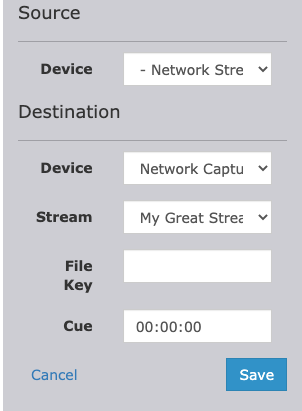 Under Source, we are going to select Network Stream as our Device. Then under Destination we will select our Network Capture option in the Device dropdown menu. Now we can select the Stream that we want to capture. (You will want to make sure you set up your stream before setting up the record) File Key is what the file will be named when it saves after the recording. If you leave this field blank it will default to what you have in the Record Event Name. Lastly, you can leave the Cue at 00:00:00, unless you want your recording to start slightly early, then click save.