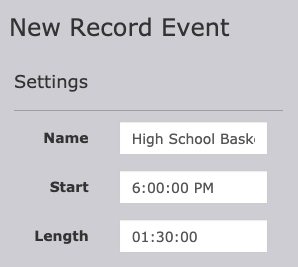 The New Record Event menu will open on the righthand side. Under Settings, put in a Name for your record event. Then enter the Start time and the Length of the event.