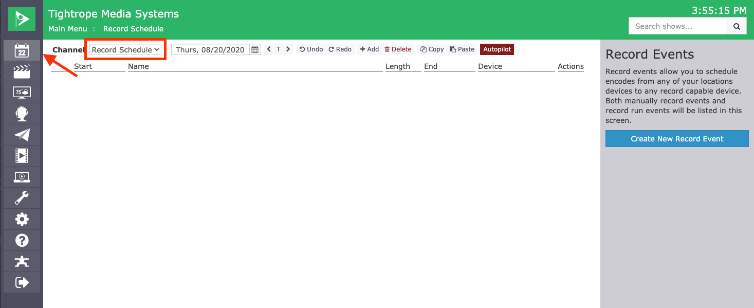 Navigate to the day of your event you are wanting record and then click on the Create New Record Event on the right.